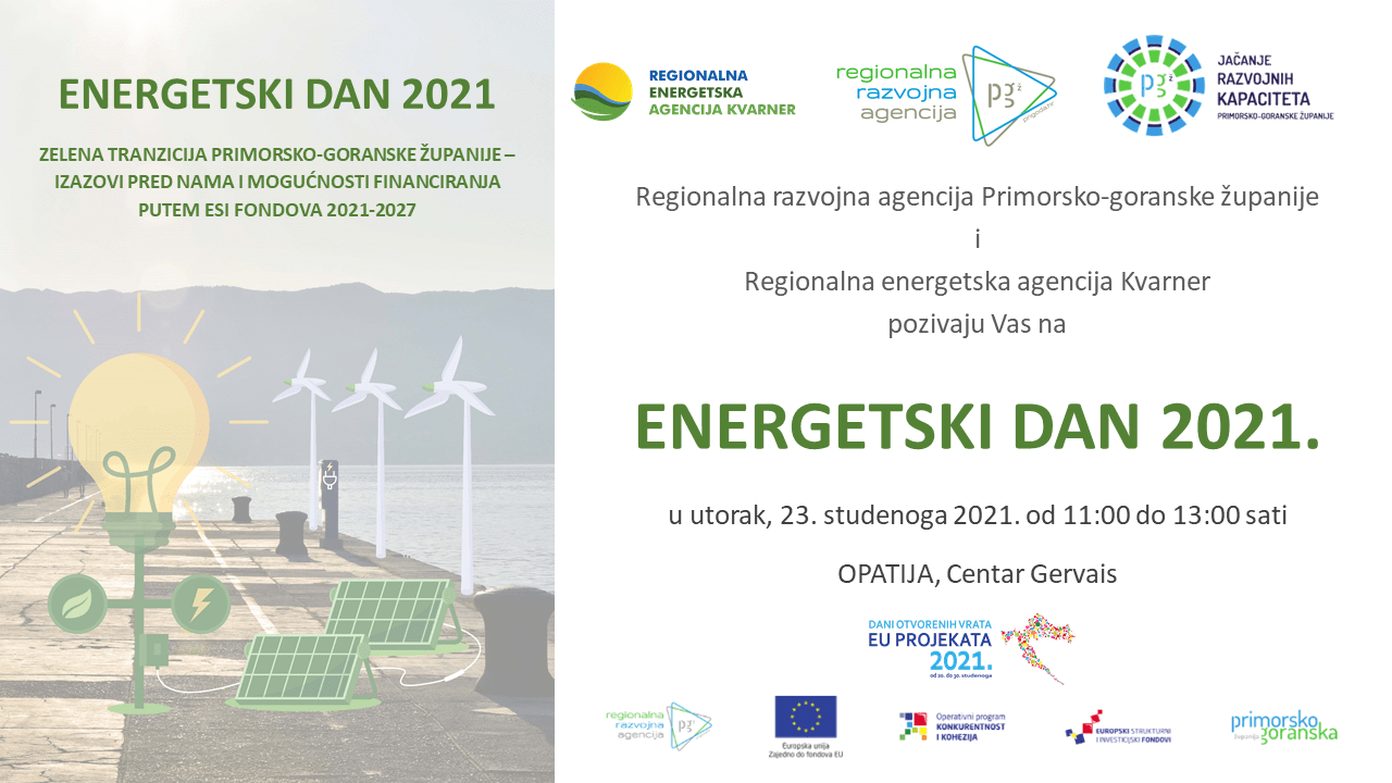 U organizaciji Regionalne razvojne agencije Primorsko-goranske županije i Regionalne energetske agencije Kvarner jučer je u opatijskom Centru Gervais, uz prijenos uživo na Vimeo kanalu, održana konferencija „Energetski dan 2021“ posvećena temama zelene tranzicije Primorsko-goranske županije, uz predstavljanje mogućnosti financiranja zelenih projekata putem ESI fondova 2021.-2027.
