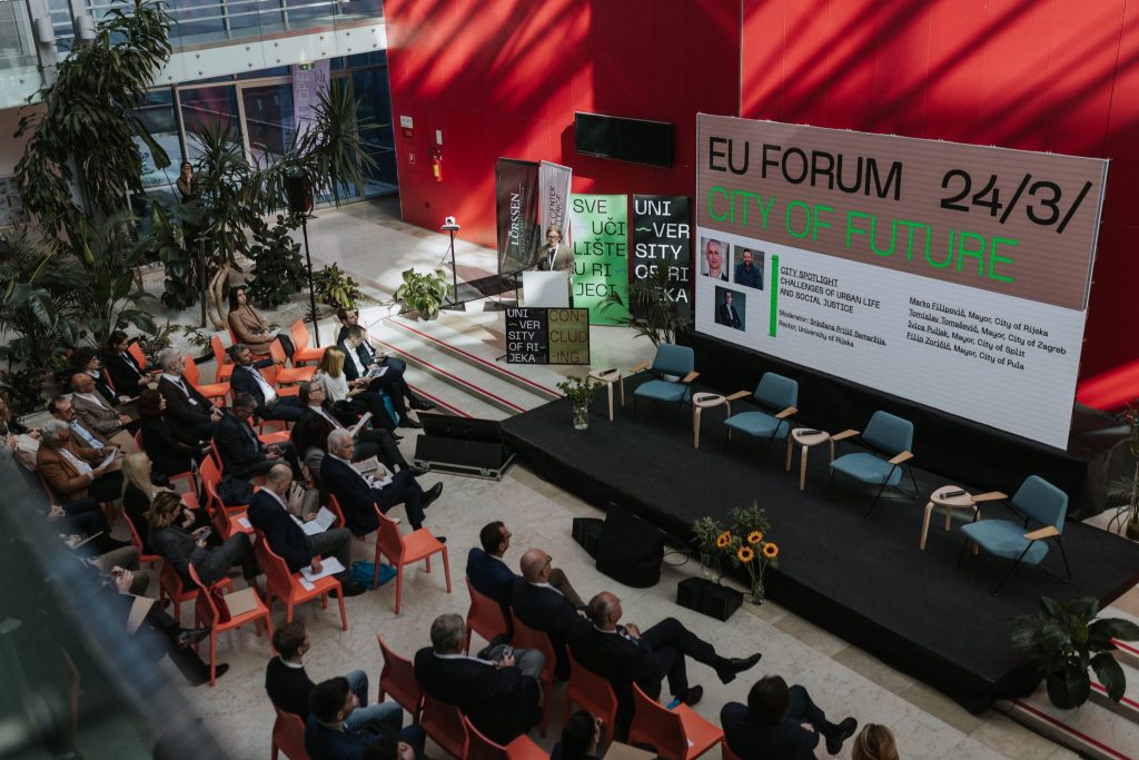 Na Kampusu Sveučilišta u Rijeci u ponedjeljak, 24. ožujka 2025. održana je cjelodnevna međunarodna konferencija – 3. Europski forum s temom ”Gradovi budućnosti”. Uvodnim riječima i pozdravnim govorima obratili su se: rektorica Sveučilišta u Rijeci prof. dr. sc. Snježana Prijić Samaržija, Peter Lürssen, izvršni direktor Grupacije Lürssen, riječki gradonačelnik Marko Filipović te ravnatelj Regionalne razvojne agencije PGŽ-a, Vedran Kružić. Video-porukom pristunima se obratila i Nikolina Brnjac, zastupnica u Europskom parlamentu.